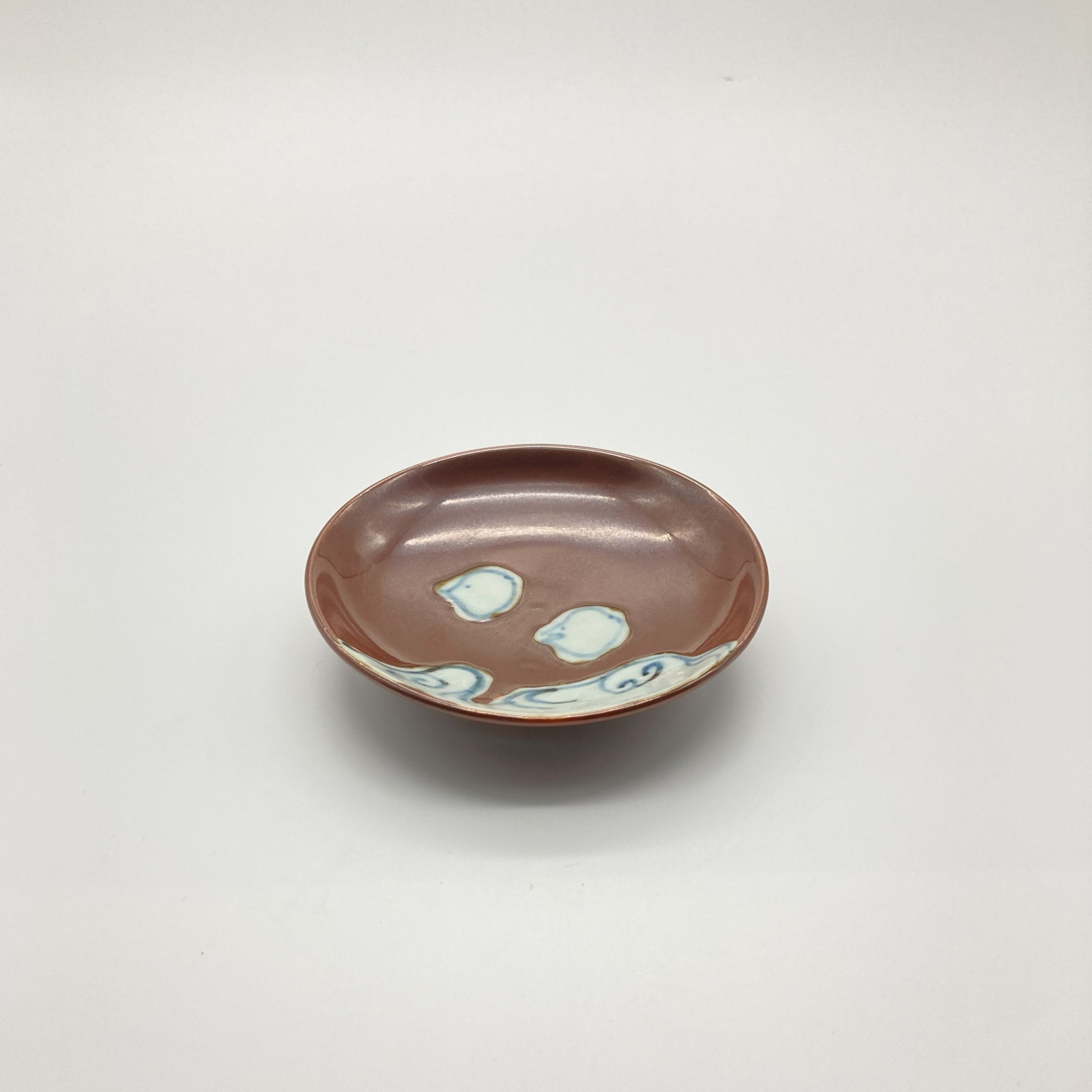 鉄釉の合間に白抜きされた千鳥たちが波の上を羽ばたく様子が描かれています。呉須のブルーがぽってりとしたブラウンに映え、おひたしなど野菜の緑が際立つ小皿です。