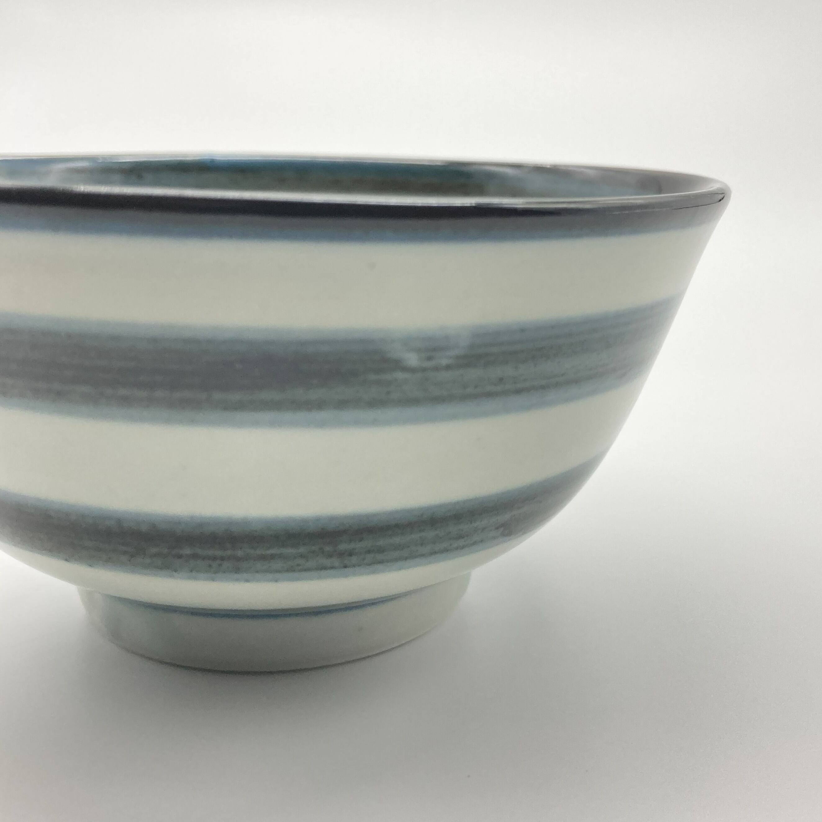 様々な料理を引き立てることを一番に、古典からインスピレーションを得たやわらかなトーンの美しい色合いと手に優しくなじみ口当たりの良さも重視されている柳川さん。ごく淡いグレーのような白地に、深みのある呉須のブルーでぐるぐると独楽文が描かれたお茶碗。ストライプ柄にも見える伝統的で遊び心ある文様は食卓のアクセントに。多くの方に使いやすいサイズ感です。