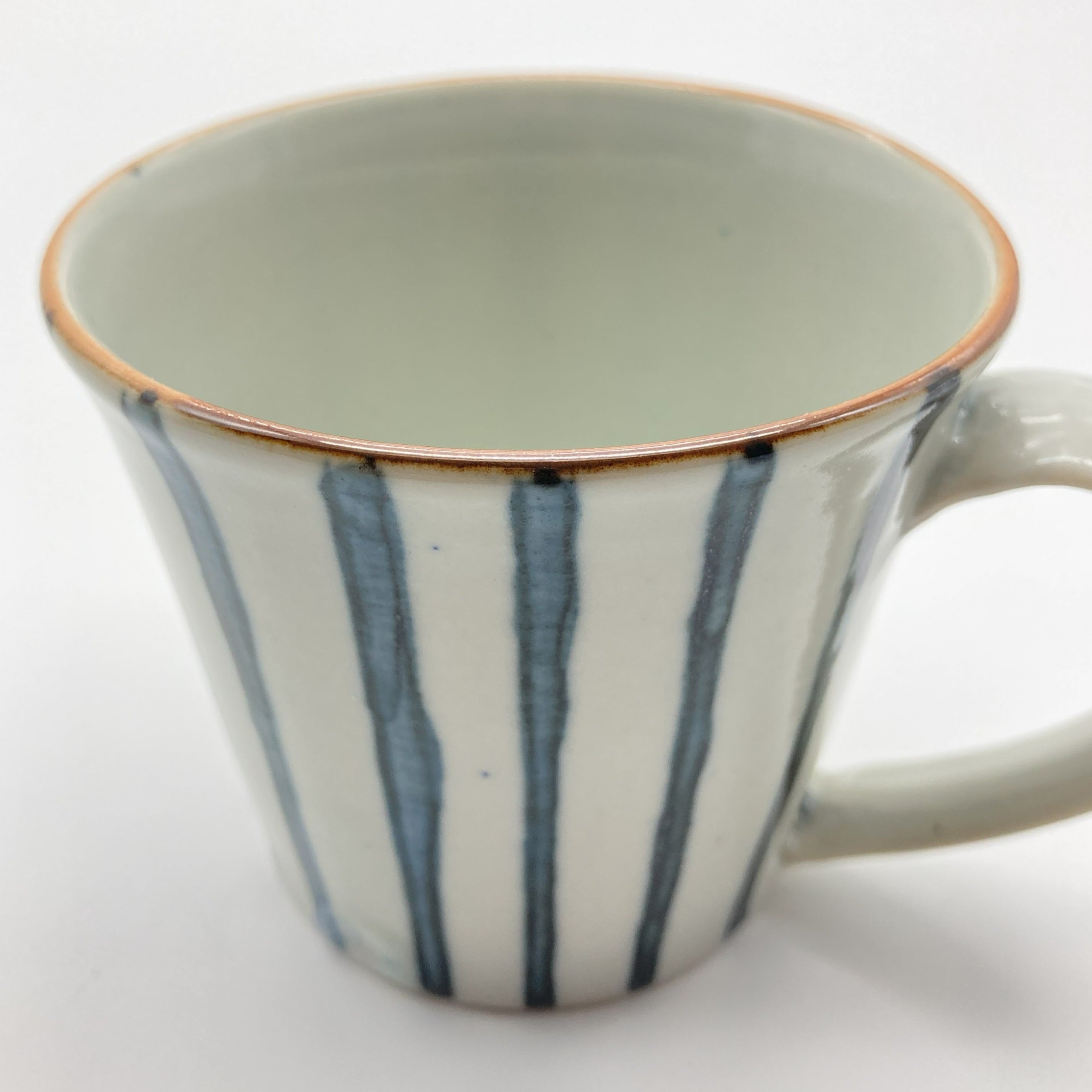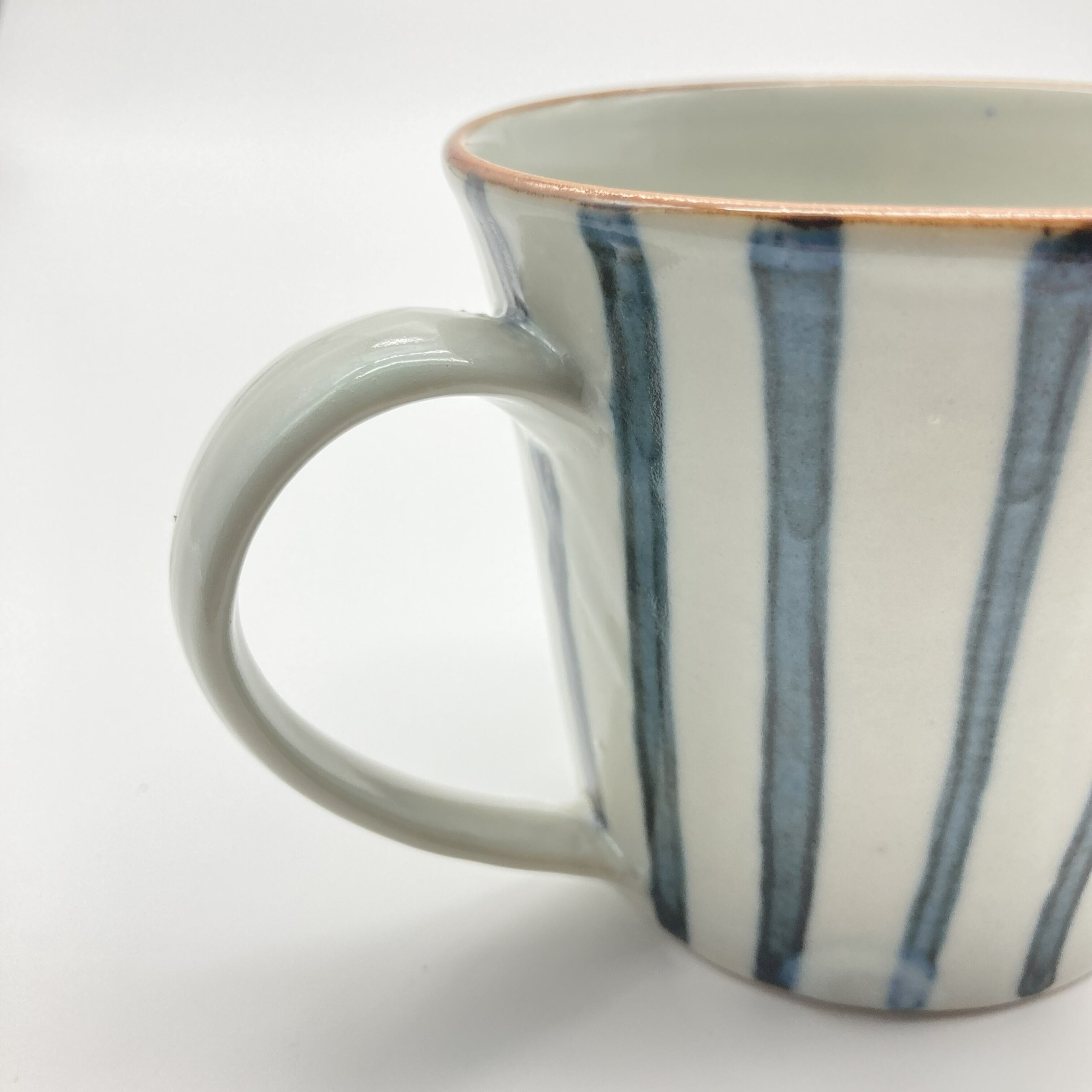 あたたかみのある手書きの縦じま柄のマグカップ。ゆったりとした取っ手の握りやすさは使う人を選ばず、心地よい口当たりは格別です。