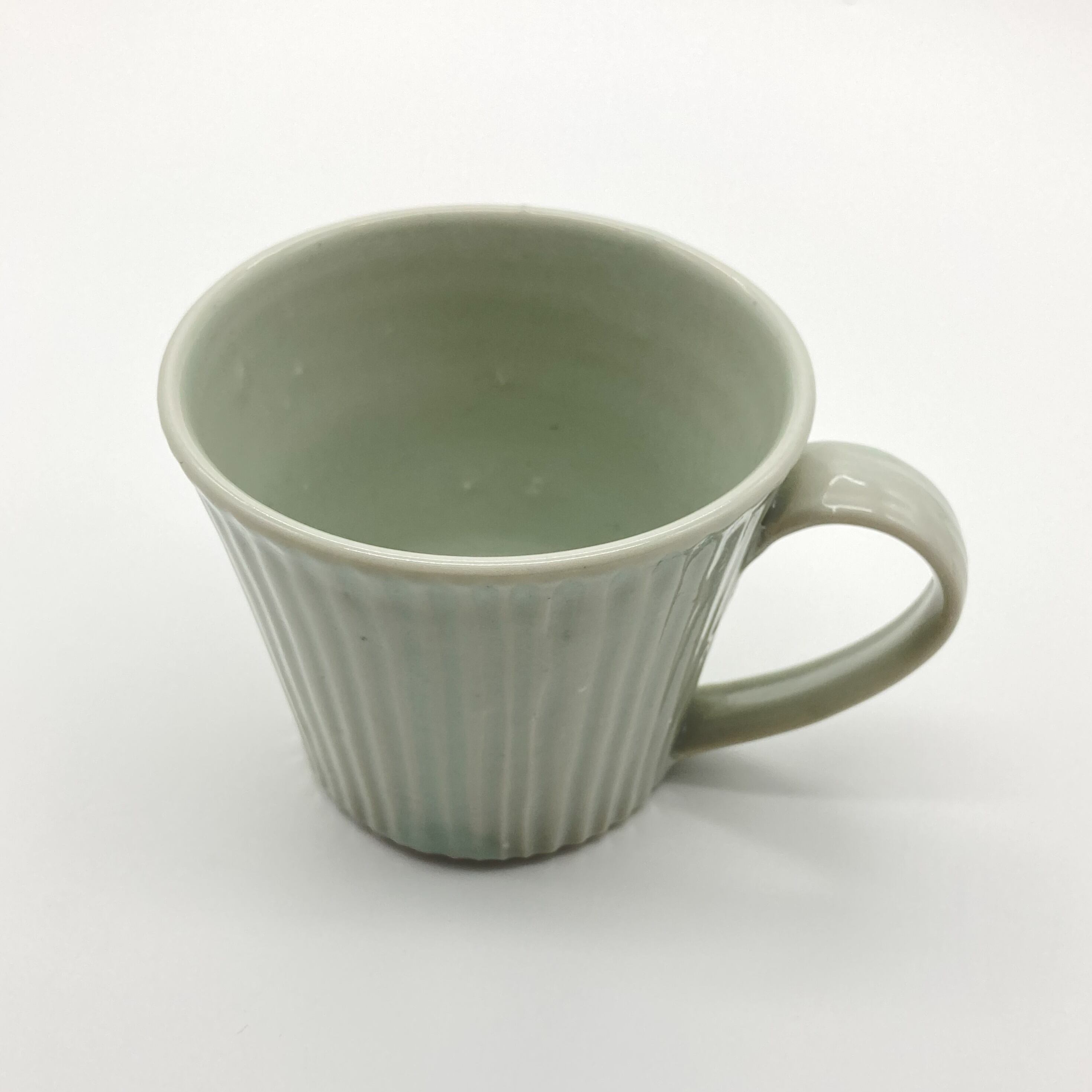 表面を丁寧に削って生み出された縦じまの陰影が美しいマグカップ。ゆったりとした取っ手の握りやすさは使う人を選ばず、心地よい口当たりは格別です。
