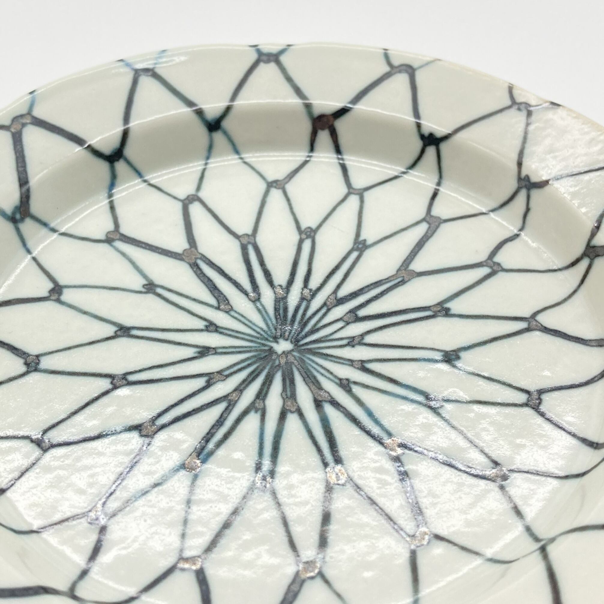 様々な料理を引き立てることを一番に、古典からインスピレーションを得たやわらかなトーンの美しい色合いと手に優しくなじみ口当たりの良さも重視されている柳川さん。わずかに輪花形状のアウトラインゆえか、古典柄なのにモダンさも感じられる端正な小皿。焼き物の茶色やお野菜の緑など、どんな食材にも映える万能さを持っています。網目模様は豊漁・繁栄などの意味も込められた伝統的かつ縁起の良い絵柄です。