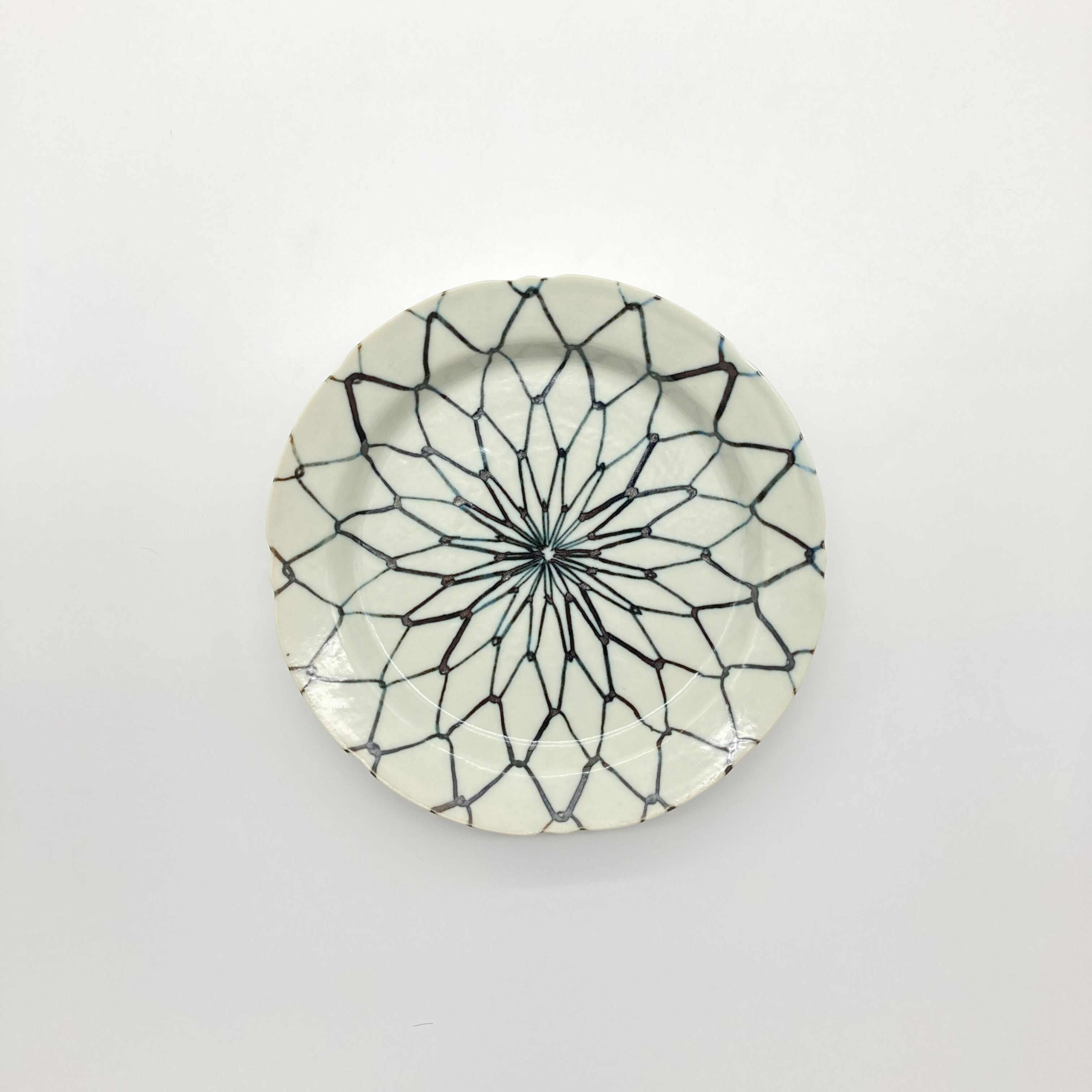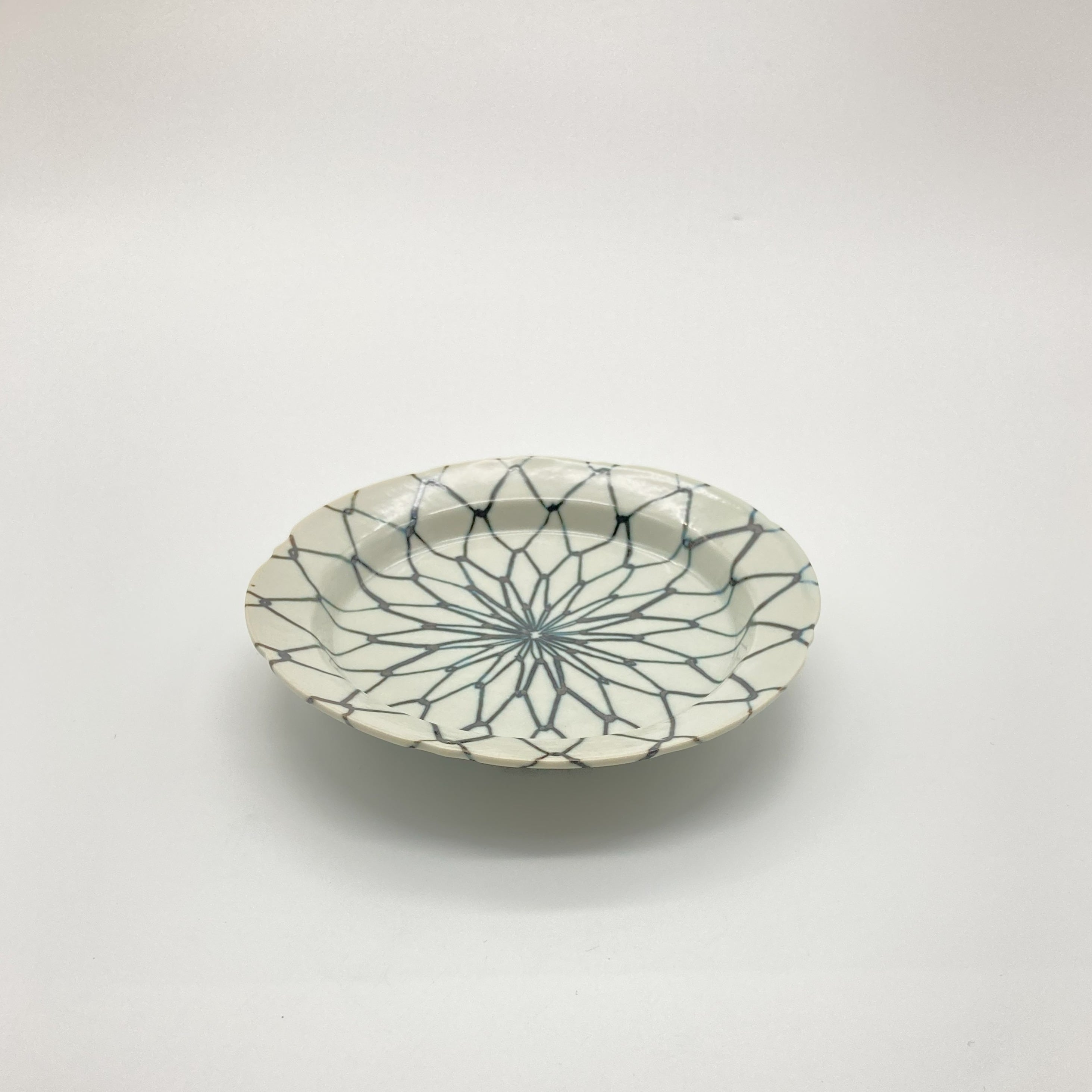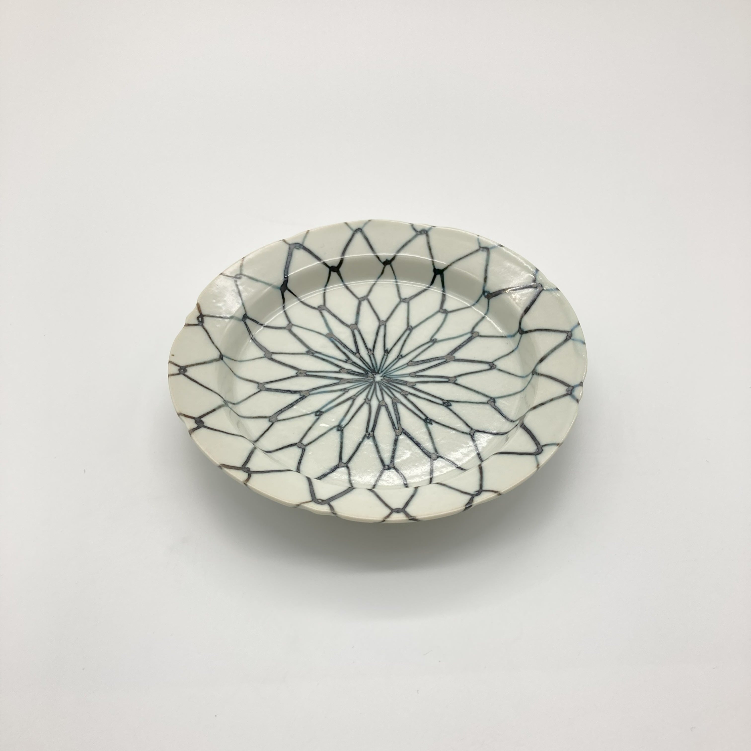 わずかに輪花形状のアウトラインゆえか、古典柄なのにモダンさも感じられる端正な小皿。焼き物の茶色やお野菜の緑など、どんな食材にも映える万能さを持っています。網目模様は豊漁・繁栄などの意味も込められた伝統的かつ縁起の良い絵柄です。