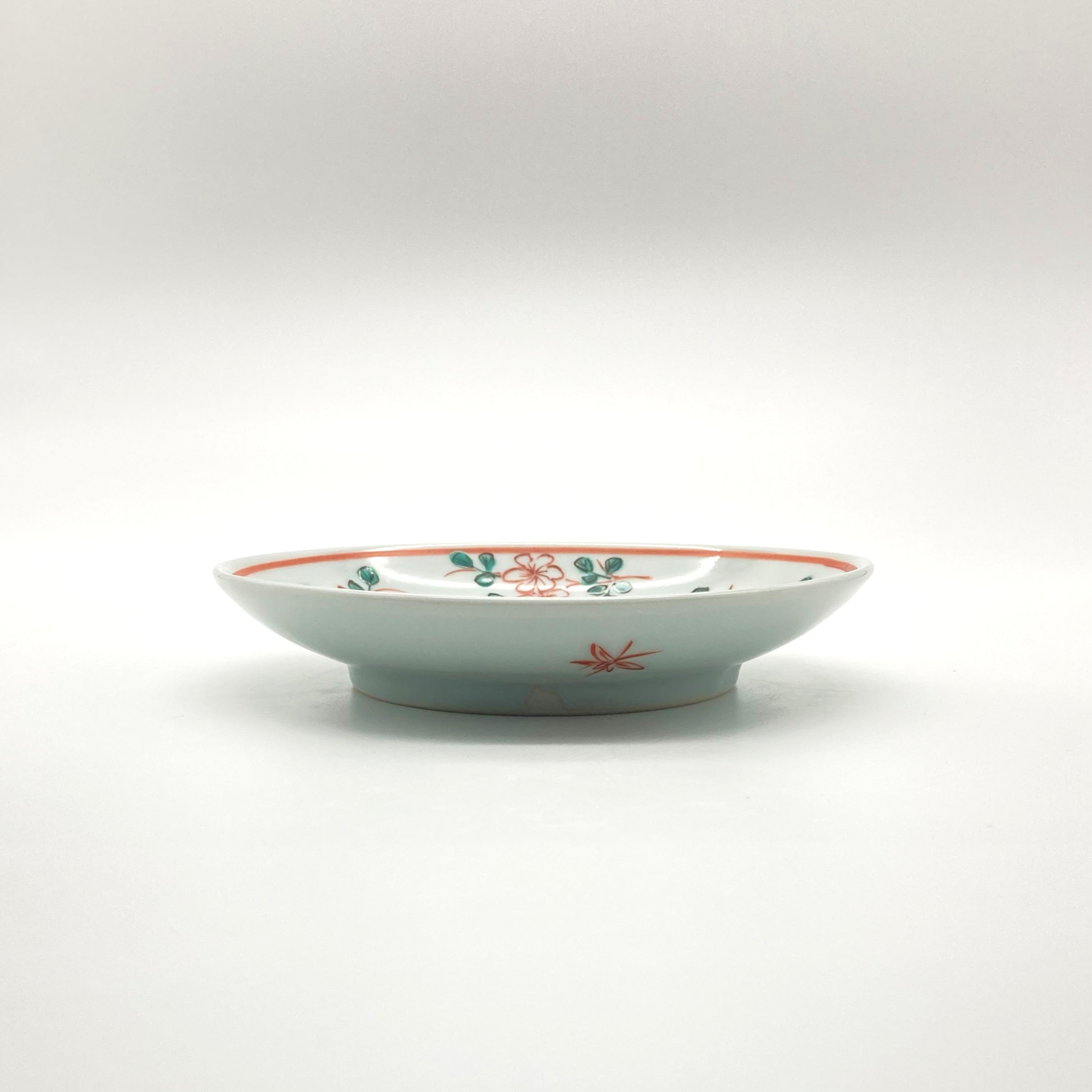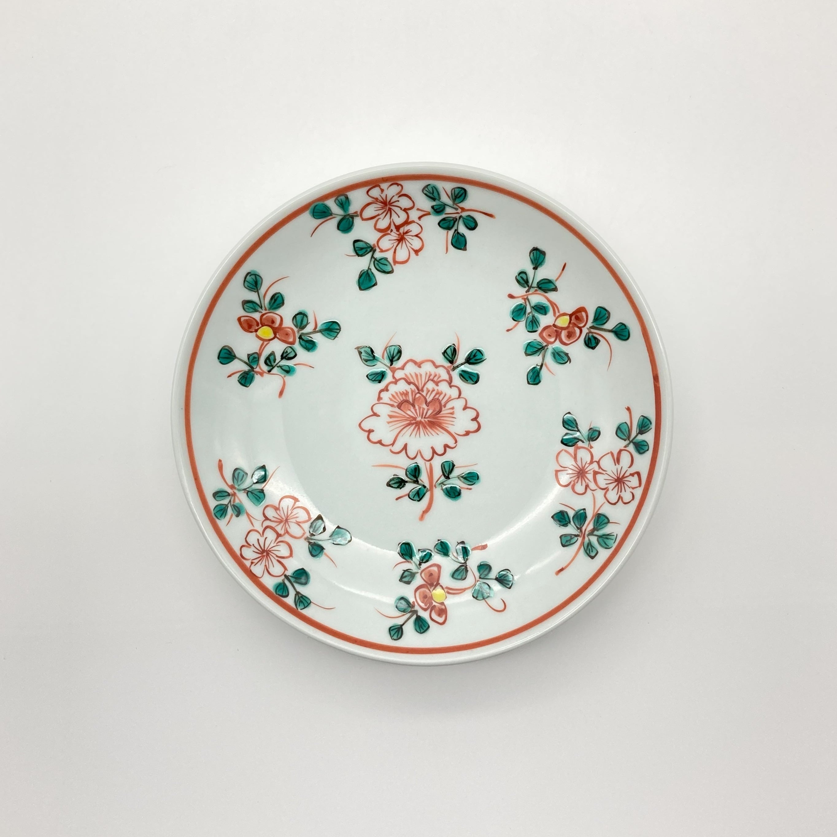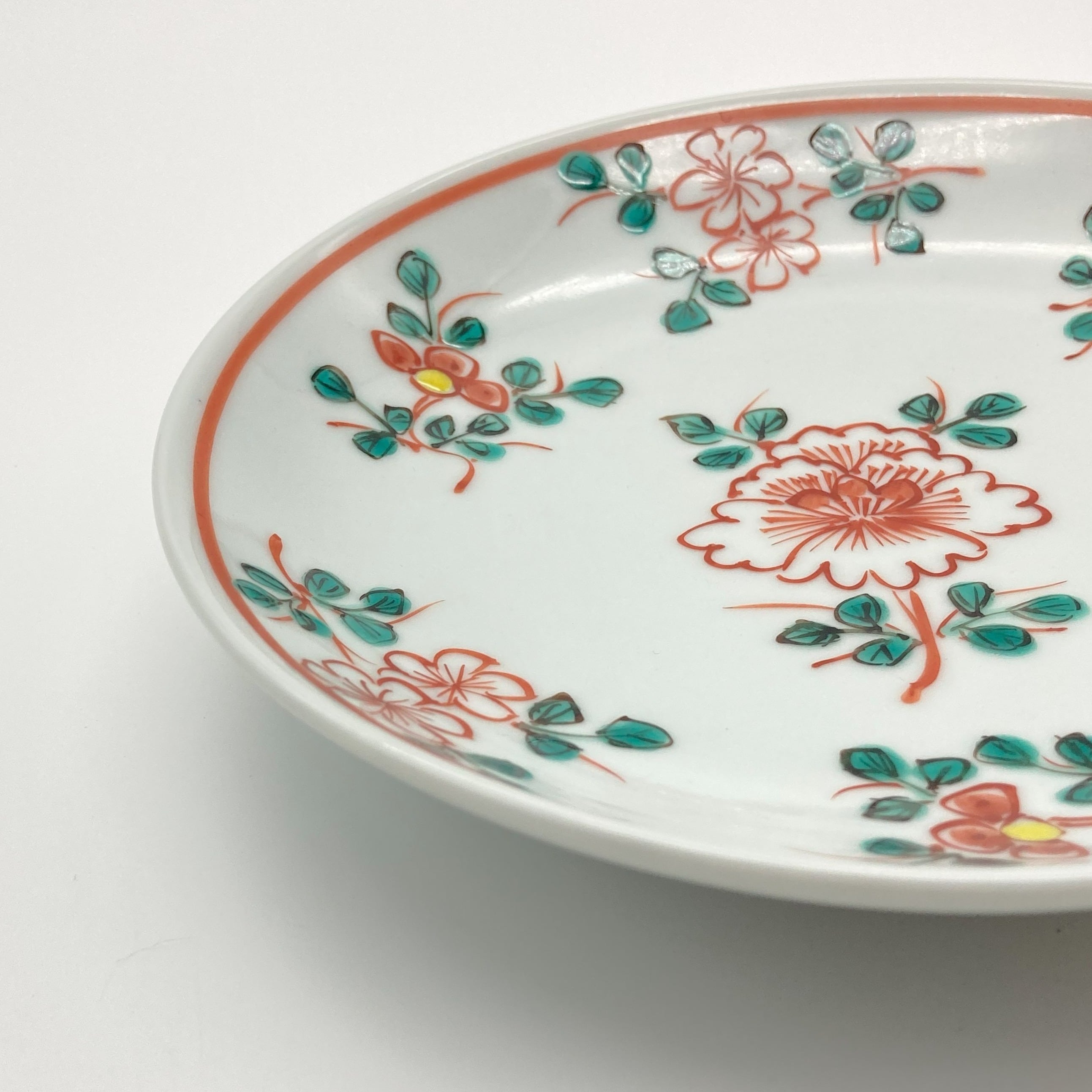 赤絵の牡丹と葉っぱの緑が美しい中~大皿。商品名にある蝶はお皿の外側に。フォーマル過ぎない華やかさは食卓を華やかに演出してくれます。