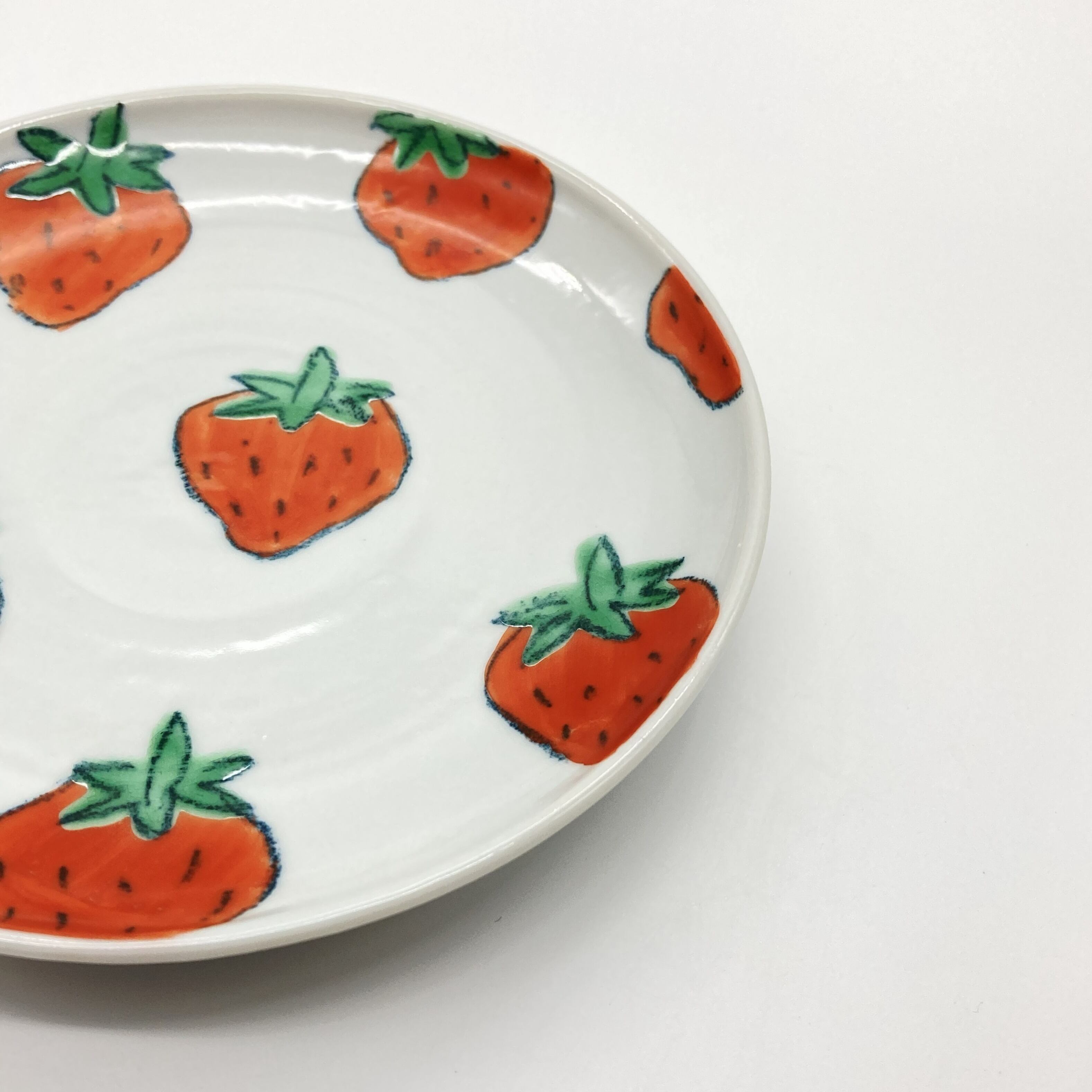落ち着いた赤でおおらかに描かれた大粒ないちごが可愛らしい「いちご」シリーズのお皿。使いやすい直径約15cmの丸い平皿です。