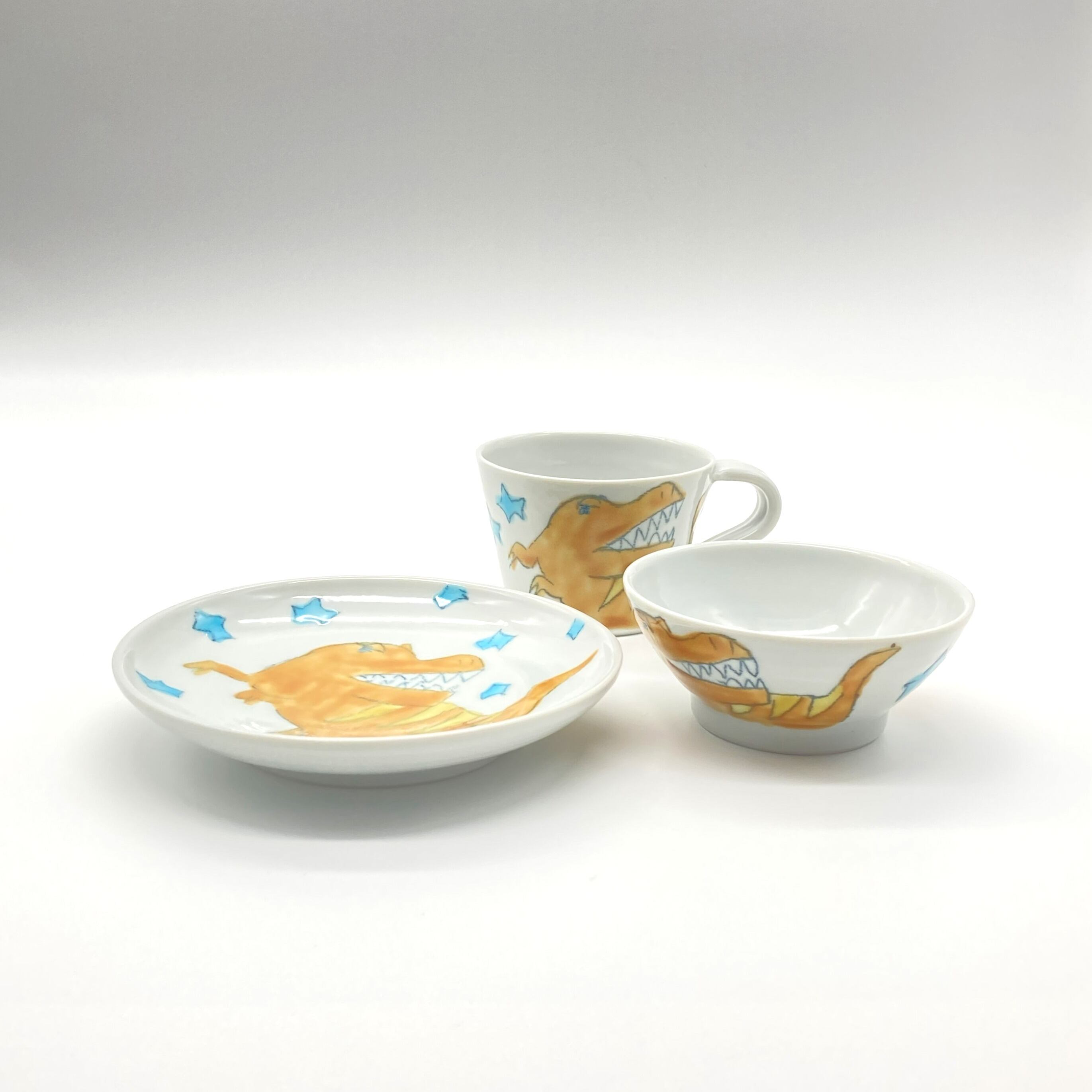 A children’s rice bowl from the “Tyrannosaurus” series by a skilled and established Kutani ware artist, featuring a bold, full‑surface illustration of a T‑Rex. The light‑blue stars add a charming accent. It’s also suitable for serving soup. The bowl is easy to hold, has a comfortable weight, and offers excellent stability to prevent tipping.