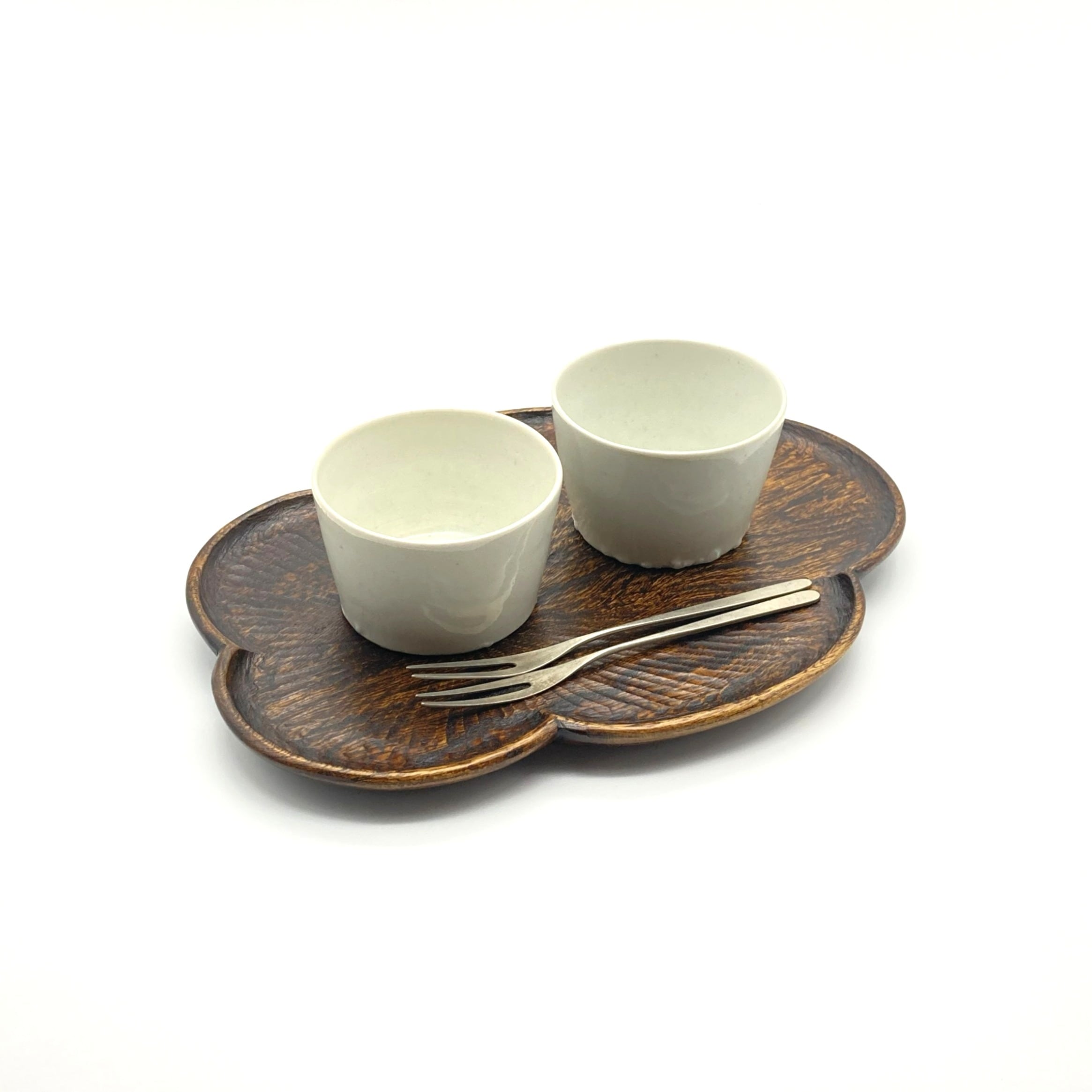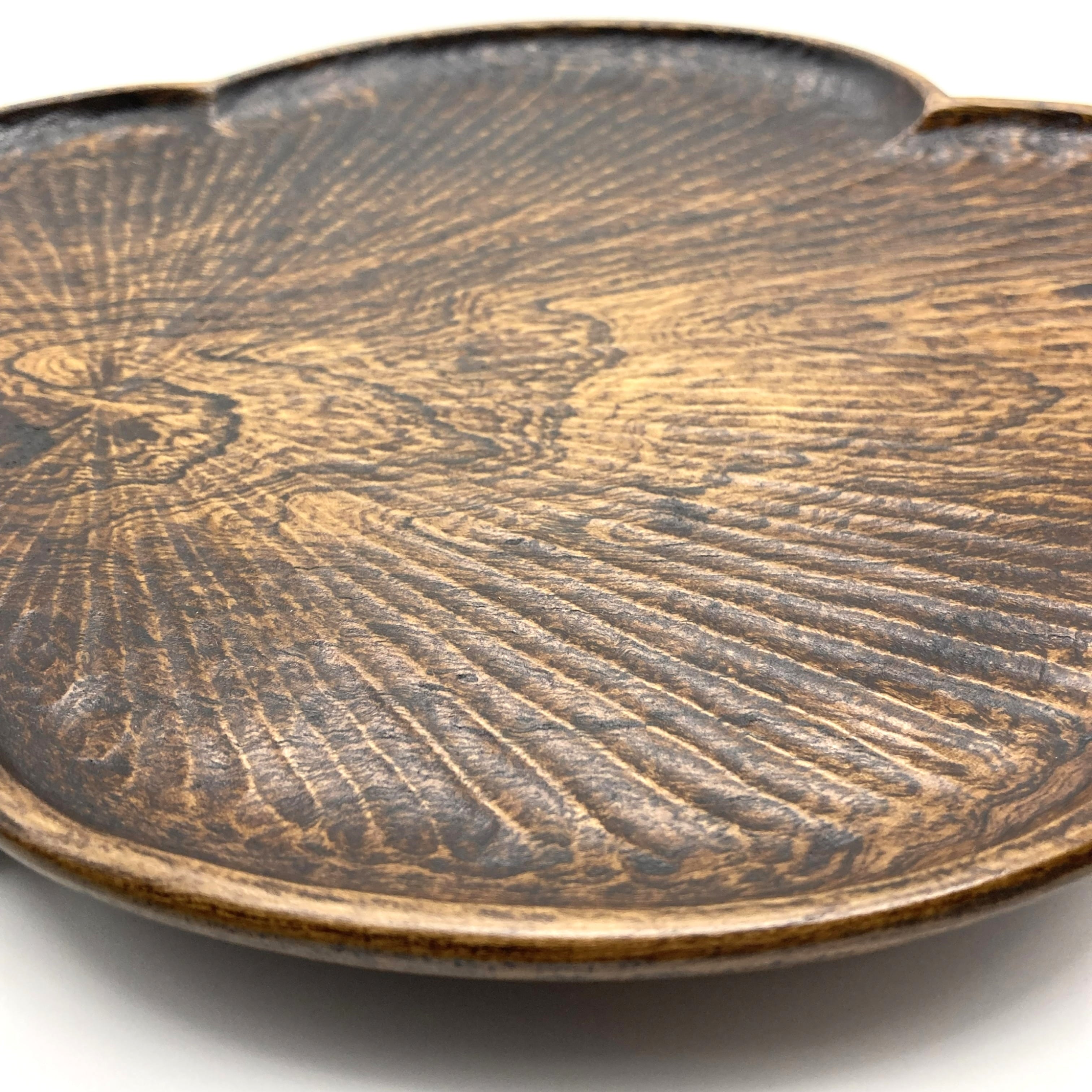 それぞれ異なる木の性質を活かし、くり抜かれた手彫りの跡と生漆を何度も塗り重ねた「拭漆」の落ち着いた風合いが特長。おおらかなで遊び心のあるアシメトリーな輪花をかたどり、ご朝食やお茶時間の小さいトレイとしてもお使いいただけます。