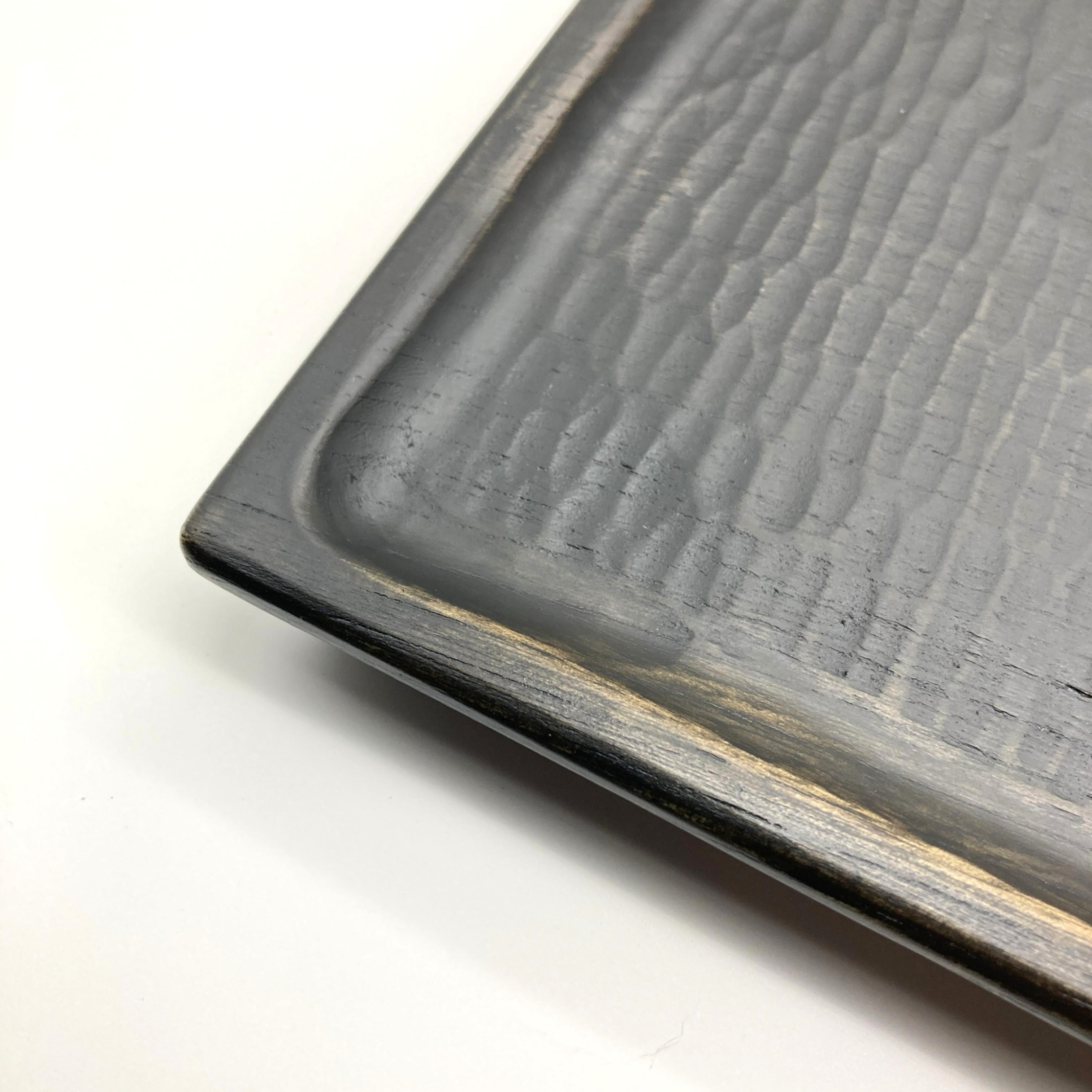それぞれ異なる木の性質を活かし、くり抜かれた手彫りの跡と生漆を何度も塗り重ねた「拭漆」の落ち着いた風合いが特長。フォーマル過ぎず落ち着いたぬくもりを感じさせるマットな黒トレイです。手彫り跡による僅かな凹凸が、うつわの滑り止めとしても活躍。見た目以上に軽く使いやすさと美しさを兼ね備えています。