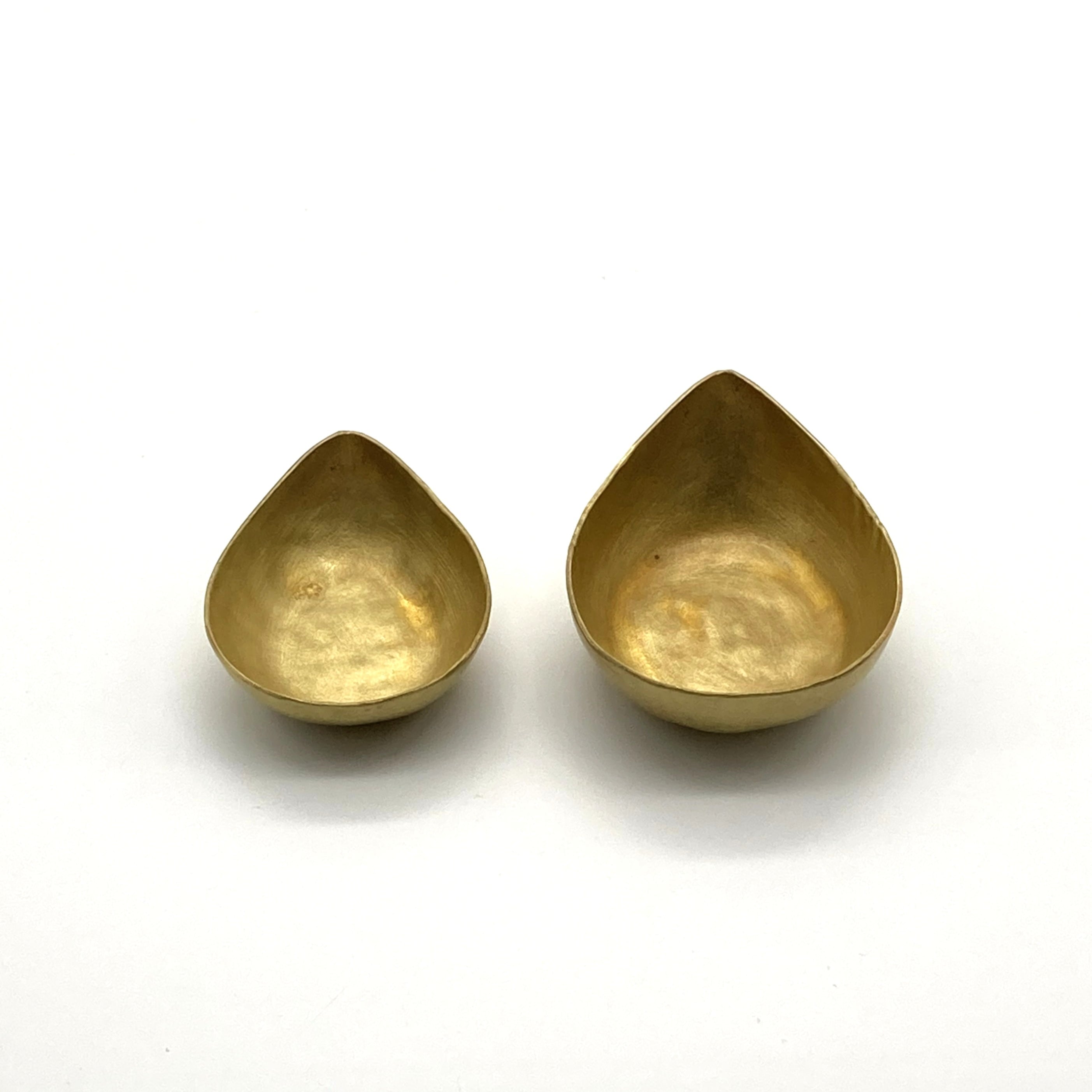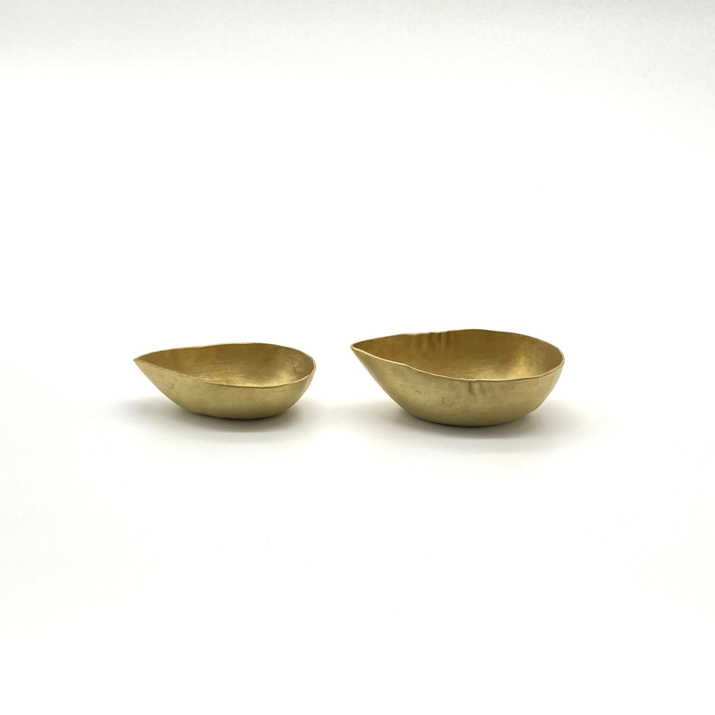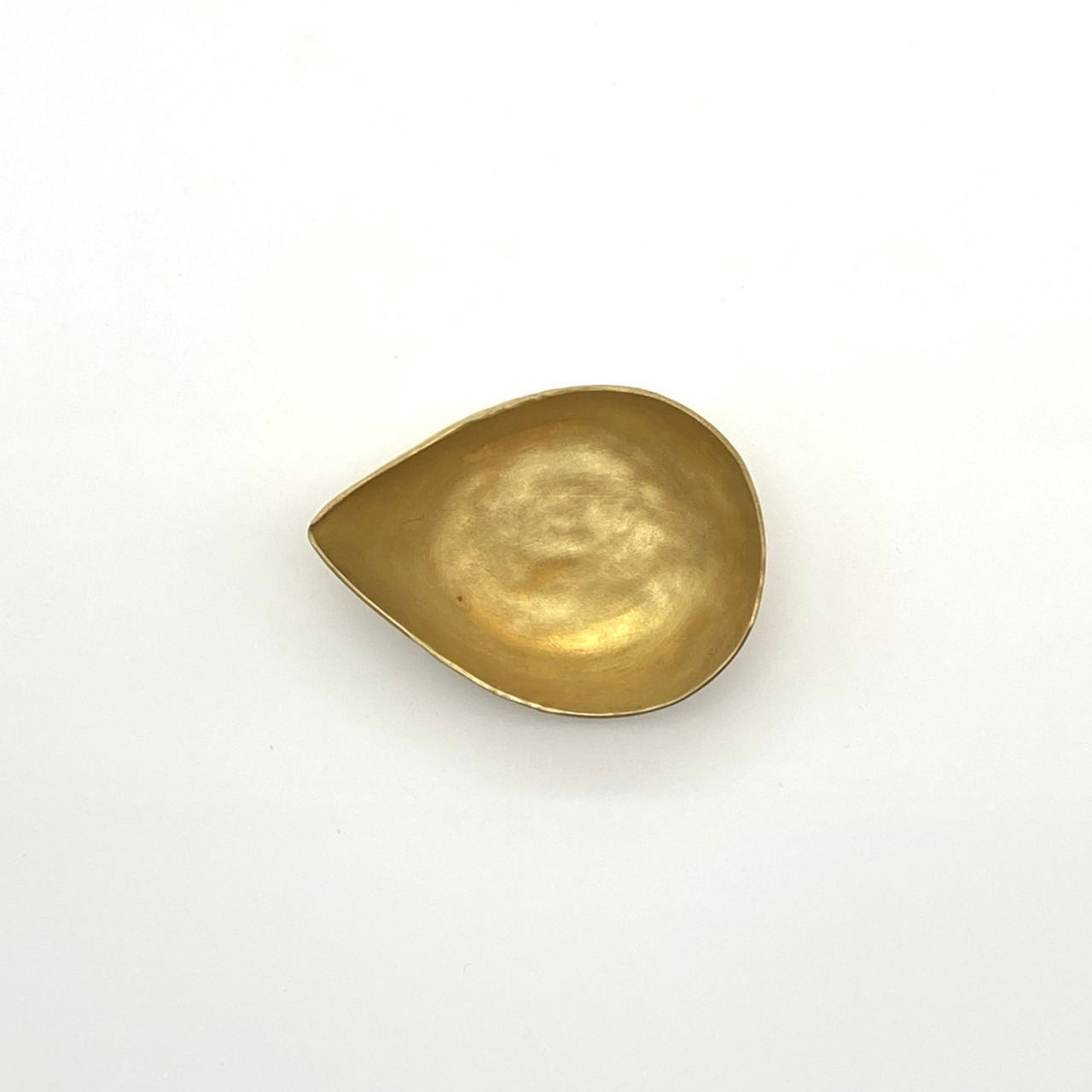 一打一打金槌を打ち込むことによって作られた、やわらかい雰囲気が日常へ取り入れやすい田中さんの作品。真鍮アイテムがひとつあるだけで食卓が引き締まります。しずくのような形のこちらの小皿は、ソースや薬味などを盛る他に、アクセサリーや鍵を入れる小物入れにもぴったり。