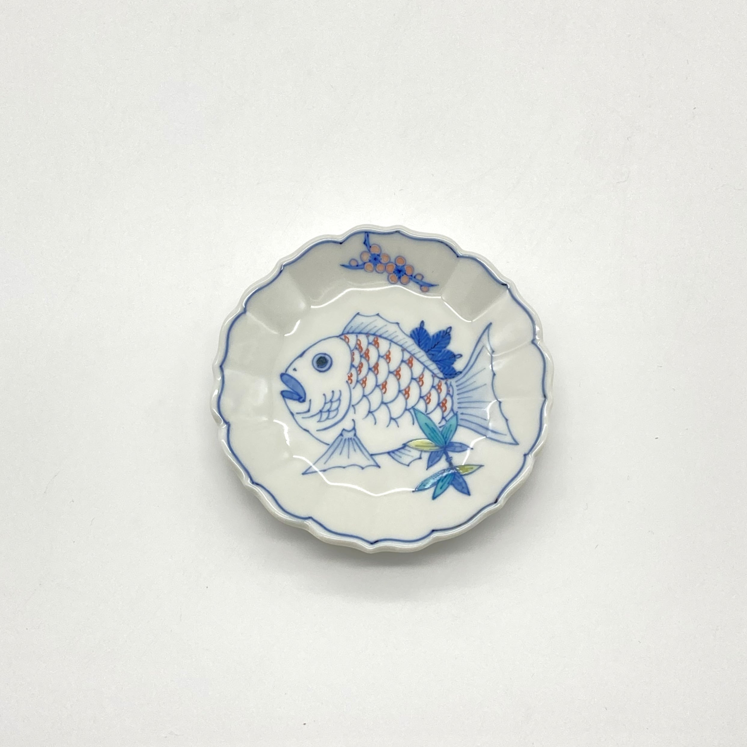 古典モチーフをベースにしながら、卓越した緻密な描画技術によって独自の図柄表現が特長の川上さん。鱗の赤がアクセントカラーとなり、共に描かれた松竹梅がおめでたい席に適した小皿。お祝いの品としてギフト用としてもぜひ。