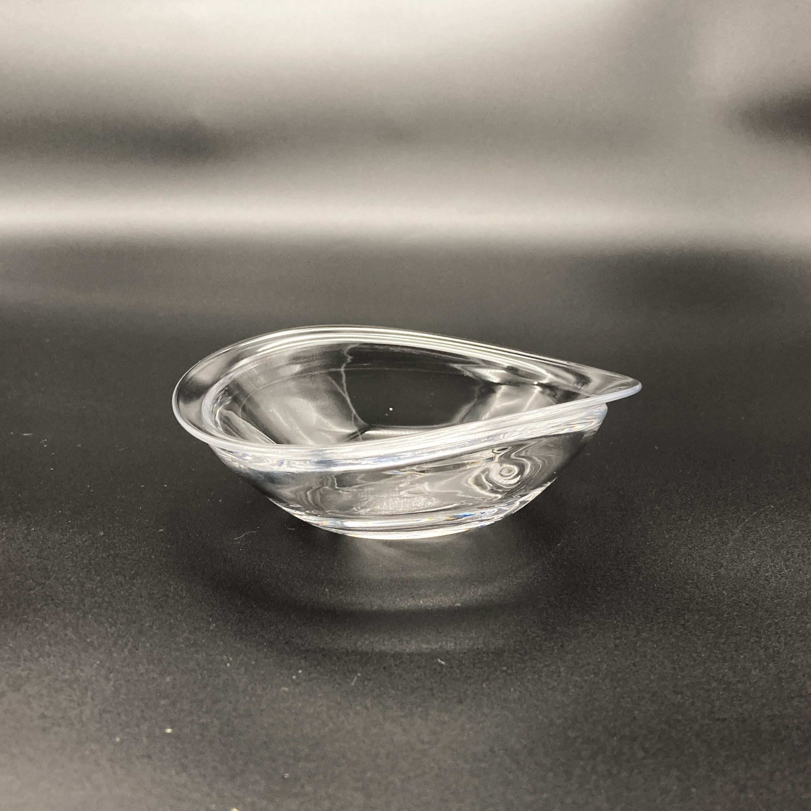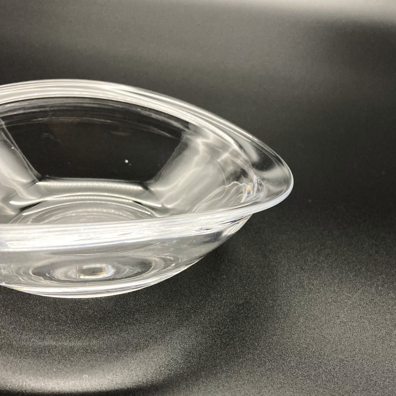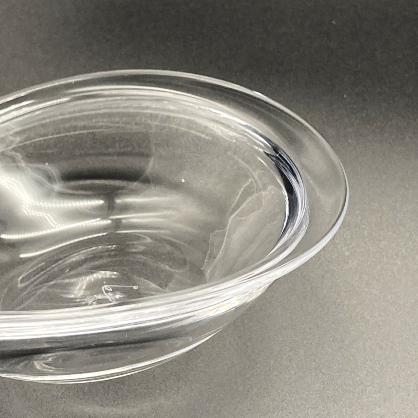 やわらかな風に揺れる水面を映し出したかのような、繊細さとぬくもりが共存する河上さんのガラスのうつわ。ほどよい厚みのある美しいフォルムで、どこか懐かしさや温かみを感じさせます。ガラスらしい「透明感」も河上さんの特長のひとつで、日常使いできることをテーマに制作されています。盛るものを選ばない店頭でも人気の小鉢のひとつ。この美しい“ゆがみ”が、シンプルなラウンドではない独特のニュアンスを生み出しています。